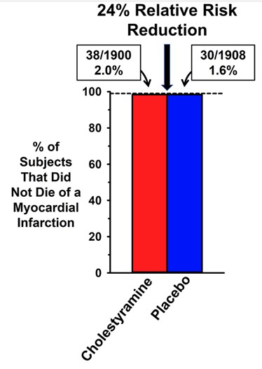 Here you see that placing patients on cholestyramine only reduced the risk of dying of a heart attack by 0.4% in absolute terms. You went from a 2% chance of having a heart attack to a 1.6% chance of having a heart attack, which is a 0.4% absolute reduction. However, this does translate into a 24% relative risk reduction in death from a heart attack.
