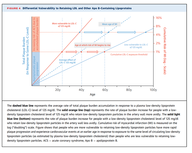 The above chart shows the difference between people who retain LDL particles better than others for the same level of LDL-C. The dashed blue line is the rate of plaque accumulation for a normal person with an LDL-C of 125 mg/dL. The orange line is the people who retain more LDL particles, yet still have an LDL-C of 125 mg/dL. The light blue solid line below is of those that don’t retain LDL particles as well, but still have an LDL-C of 125 mg/dL.