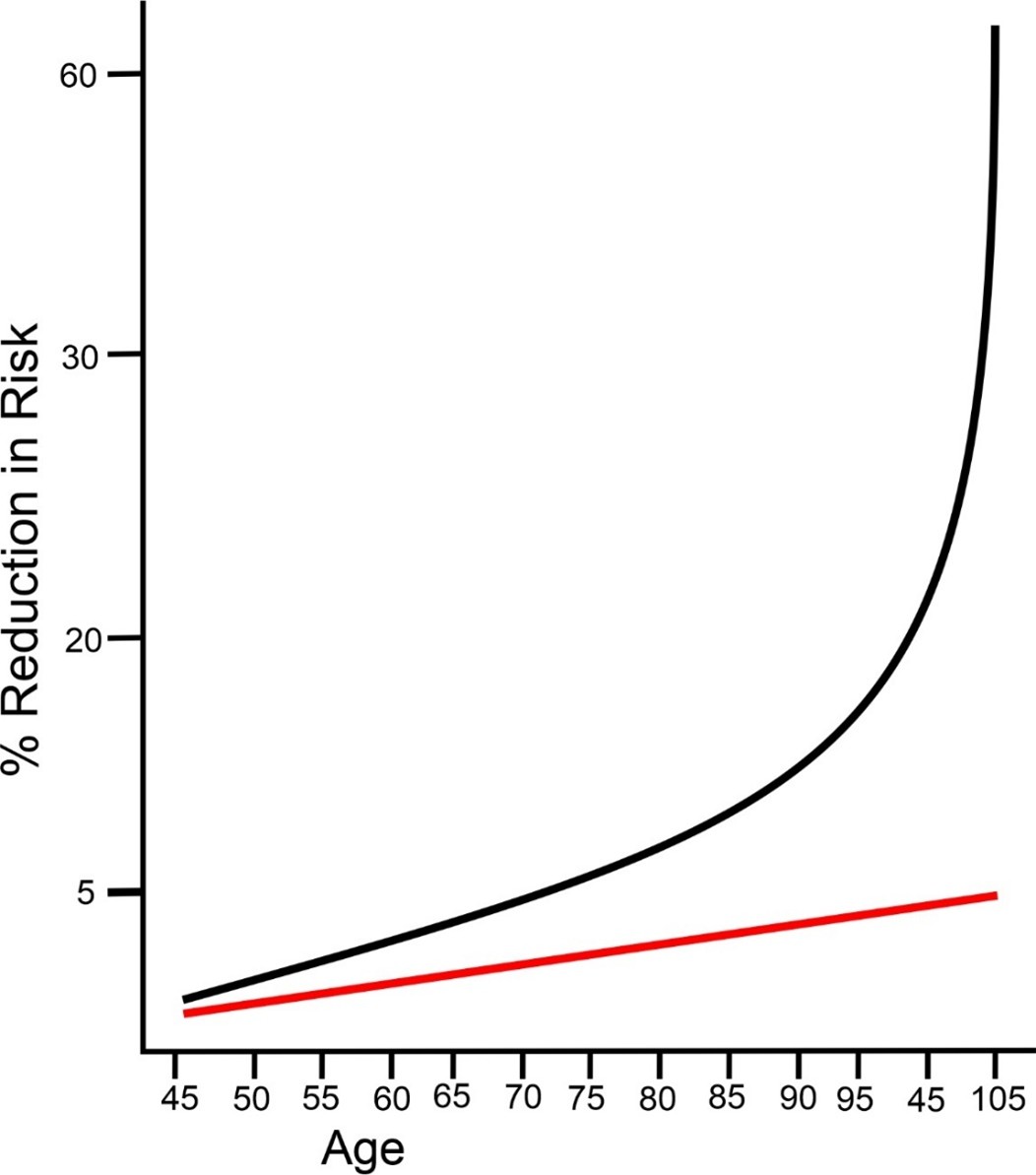 Another very well done article published by Brian Ference demonstrated that the absolute risk reduction is much greater than expected and increases with time. Again, the area under the curve will shrink in your favor, the sooner you lower your LDL-C or apoB.