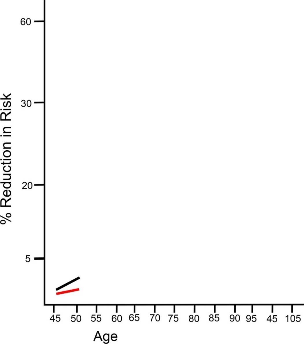 Here you can see two different individuals being exposed to different levels of LDL-C. The blue line is someone who is exposed to an LDL-C of 125 mg/dL for many years. The orange line is someone being exposed to 80 mg/dL for many years. At age 50, they started lipid lowering therapy in the person with the higher LDL-C. They dropped their LDL-C by about 40 mg/dL. This conferred a 25% relative risk reduction. If they had started earlier in life, they would have had much more pronounced risk reduction.