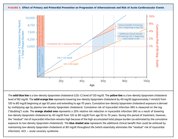 As you can see the cumulative LDL-C exposure threshold is 5000 mg/years. If your LDL-C is 125 mg/dL and you are 40 years old. Multiply 40 x 125, and you get 5000 mg/years. You have plaque and ASCVD. Over 5000 mg/years and you have ASCVD. That’s the current threshold. And we know that if your LDL-C is above 60 mg/dL, then you are laying down plaque.