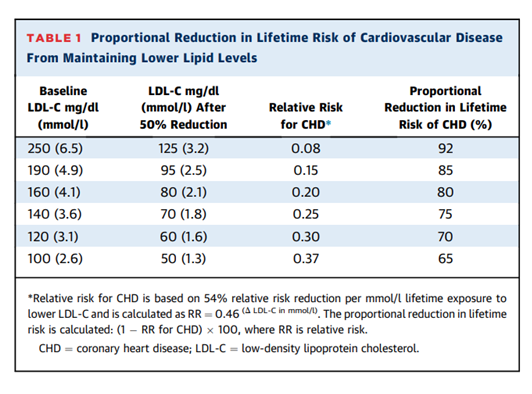 You see from this table that the higher your baseline LDL-C, the more profound reduction in ASCVD with a 50% reduction in LDL-C. Look at the top row that started out with an LDL-C of 250 mg/dL. With a 50% reduction to 125 mg/dL, they reduced their lifetime risk of CVD by 92%. Whereas if you started with an LDL-C of 100 mg/dL, cutting that in half to 50 mg/dL, provided you with a 65% lifetime risk reduction. Those with the highest baseline LDL-C will benefit the most from a 50% reduction over their lifetime.