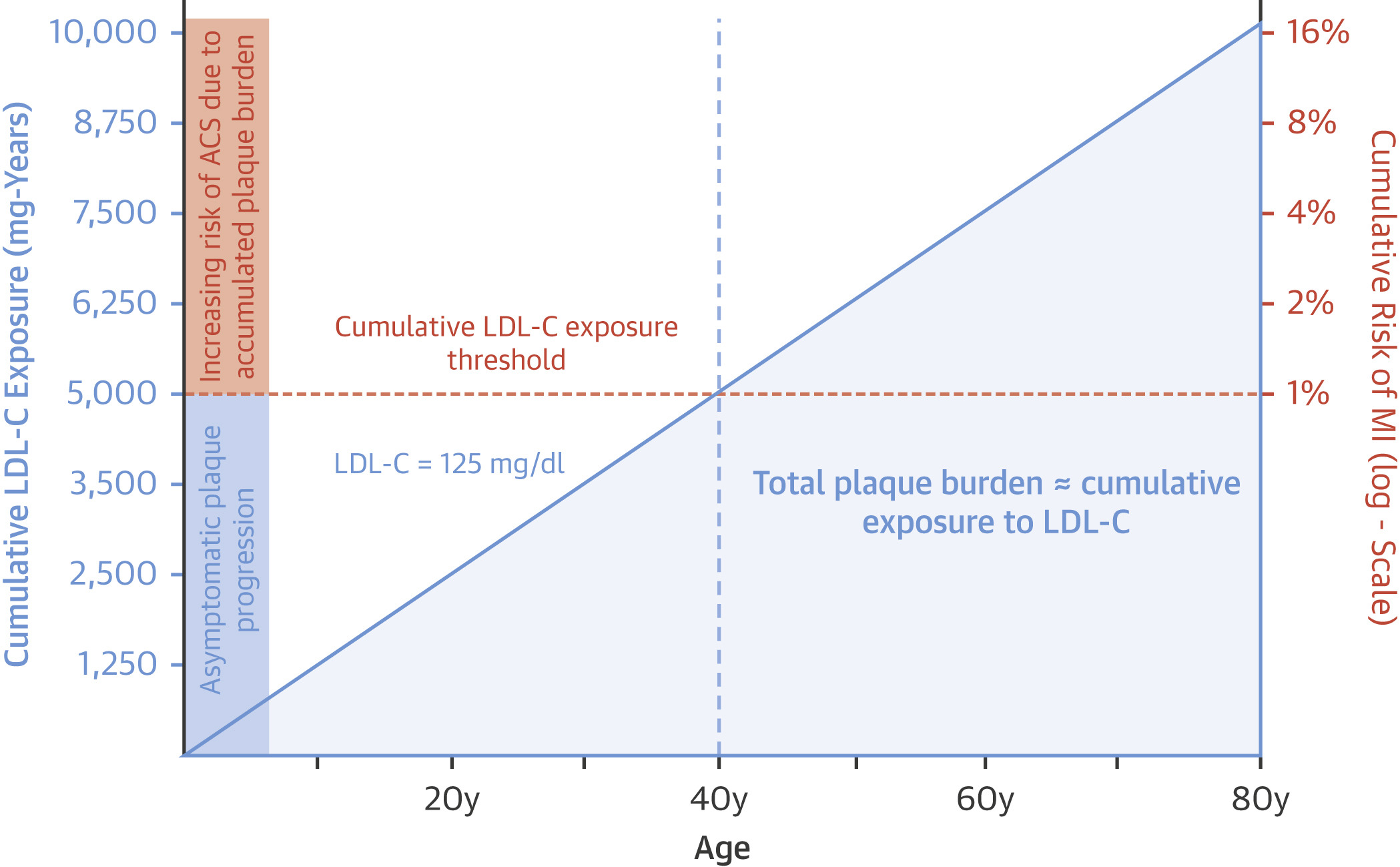 The solid blue line represents constant exposure to plasma low-density lipoprotein cholesterol (LDL-C) of 125 mg/dl. Cumulative low-density lipoprotein cholesterol exposure is derived by multiplying age by plasma low-density lipoprotein cholesterol. The shaded area under the solid blue line represents the accumulating total plaque burden (which is directly proportional to both age and cumulative exposure to low-density lipoprotein cholesterol). The horizontal orange dashed line represents the cumulative low-density lipoprotein cholesterol (and therefore total plaque burden) needed to result in a measurable increase in the risk of myocardial infarction (MI). It is derived by multiplying age 40 years (age at which the cumulative incidence of myocardial infarction exceeds 1%) by 125 mg/dl (plasma low-density lipoprotein cholesterol level). Beyond this threshold, if the plasma low-density lipoprotein cholesterol level remains constant, then both cumulative low-density lipoprotein cholesterol exposure and total plaque burden increase linearly, but the risk of myocardial infarction rises log-linearly (and is shown on the right-hand side y-axis expressed on the log or “doubling scale”). ACS = acute coronary syndrome.