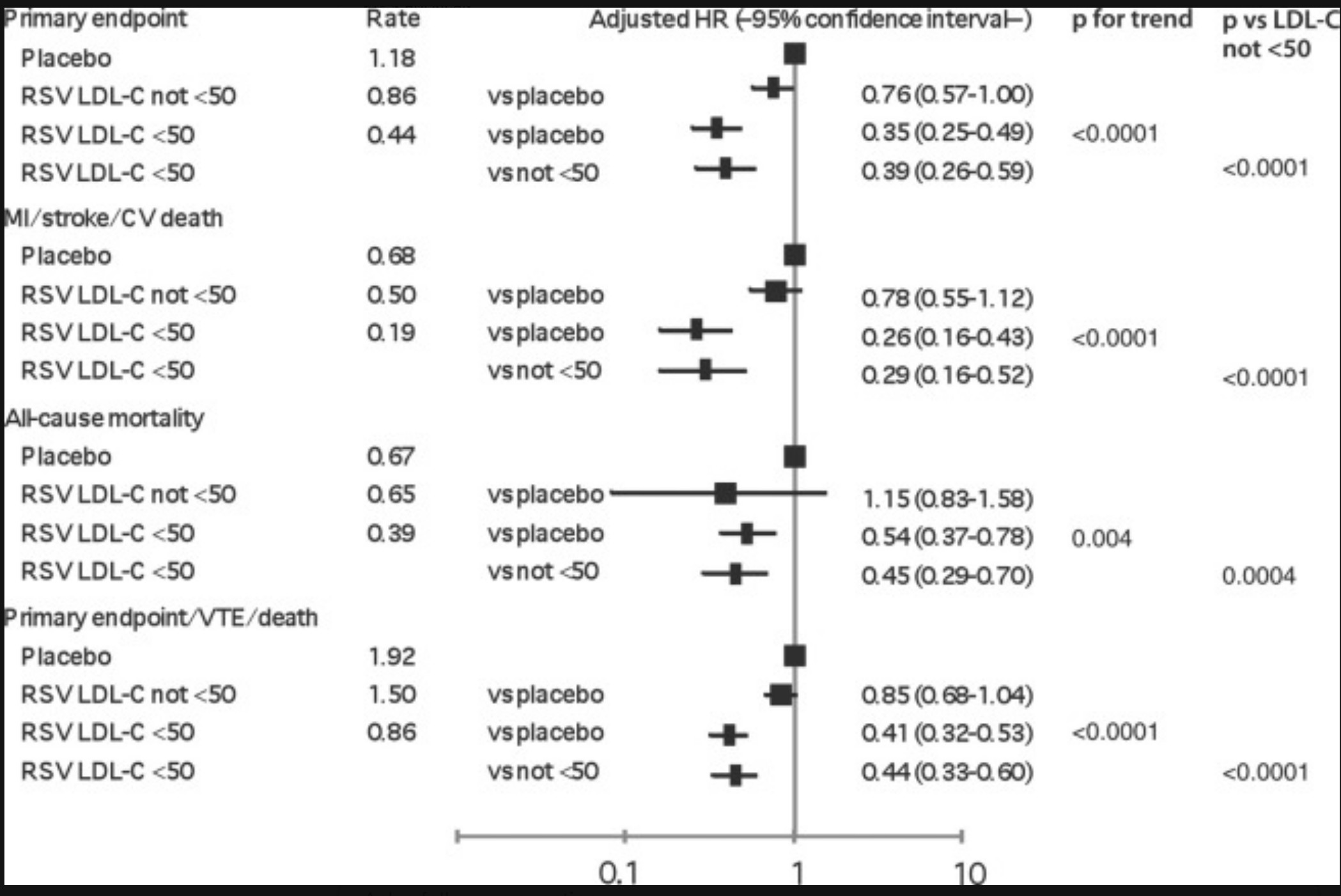 There was a highly significant monotonic relationship between lower achieved LDL-C levels and reduced risk of both the primary endpoint (cardiovascular death, MI, stroke, hospitalization for unstable angina, or coronary revascularization) and the key secondary endpoint (cardiovascular death, MI, or stroke), with adjusted P-trend <0.0001 for each endpoint, extending down to levels below 20 mg/dL.