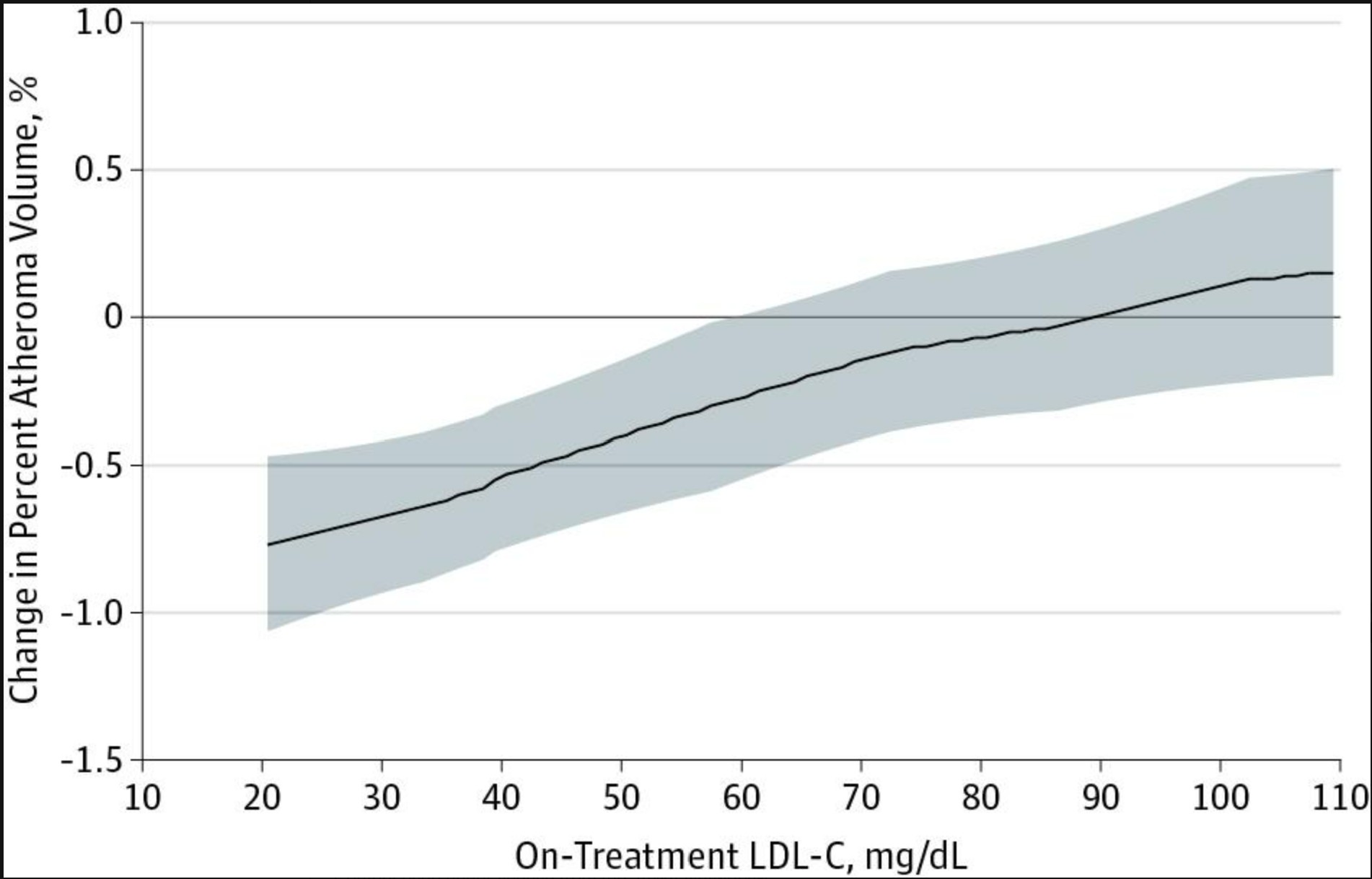 The results were unambiguous. The group achieving LDL-C of 37 mg/dL showed actual reduction in both percent atheroma volume and total atheroma volume—meaning their plaques were shrinking. This provided direct evidence that intensive LDL-lowering therapy can not only halt plaque progression but actually reverse existing atherosclerotic disease.