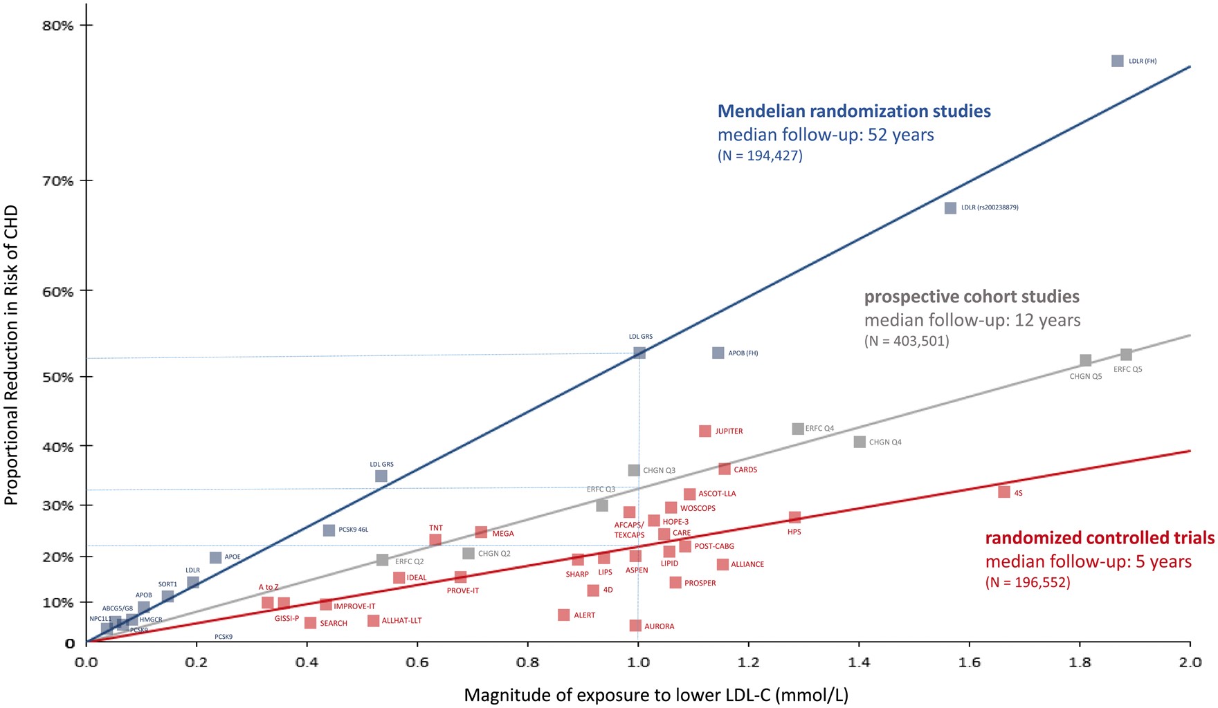 Figure Above: Log-linear association per unit change in low-density lipoprotein cholesterol (LDL-C) and the risk of cardiovascular disease as reported in meta-analyses of Mendelian randomization studies, prospective epidemiologic cohort studies, and randomized trials. The increasingly steeper slope of the log-linear association with increasing length of follow-up time implies that LDL-C has both a causal and a cumulative effect on the risk of cardiovascular disease. The proportional risk reduction (y axis) is calculated as 1−relative risk (as estimated by the odds ratio in Mendelian randomization studies, or the hazard ration in the prospective epidemiologic studies and randomized trials) on the log scale, then exponentiated and converted to a percentage. The included meta-analyses were identified from (i) MEDLINE and EMBASE using the search terms meta-analysis, LDL, and ‘cardiovascular or coronary.
