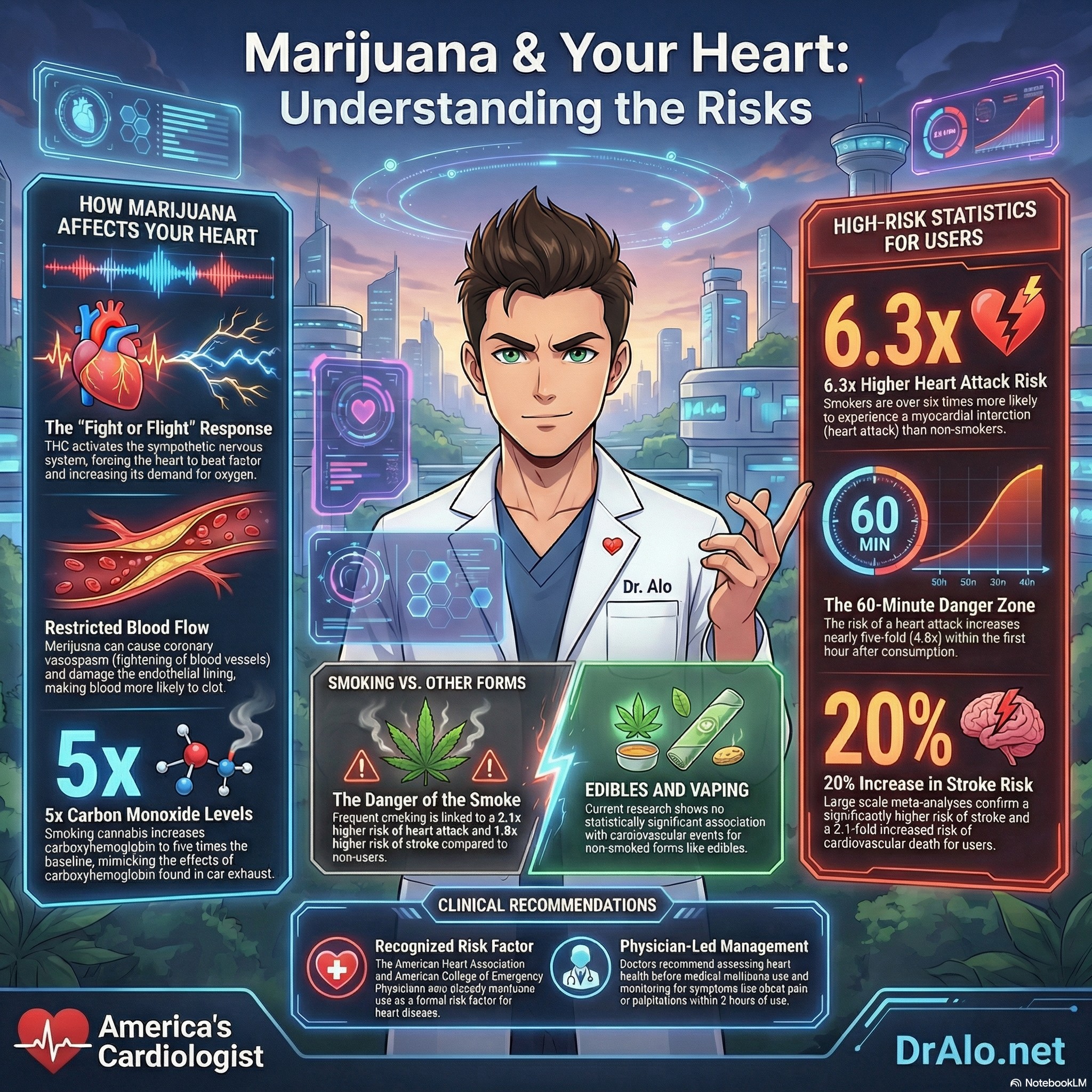 As marijuana becomes legal in more places across the United States, it's important to understand how it affects your heart. Recent research shows that using marijuana can increase your risk of serious heart problems, including heart attacks, strokes, and irregular heartbeats. I get asked about this frequently on social media, and we have very robust data now.