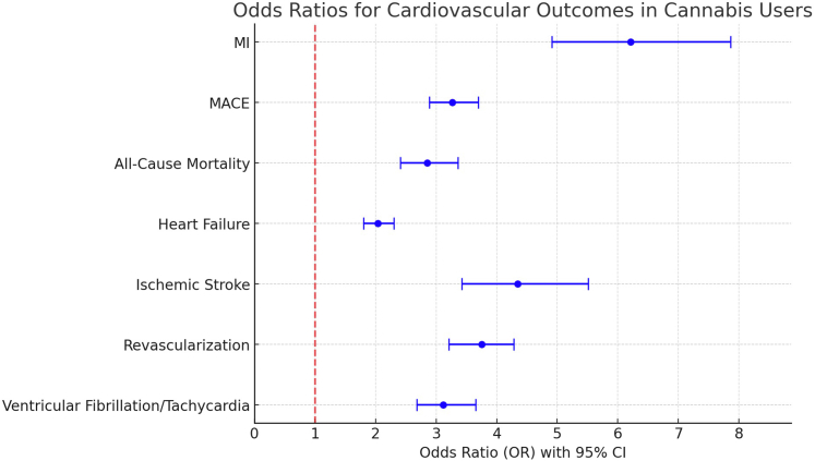 Odd Ratios With 95% CIs for Cardiovascular Outcomes in Cannabis Users Compared to Nonusers MACE = major adverse cardiovascular events; MI = myocardial infarction.