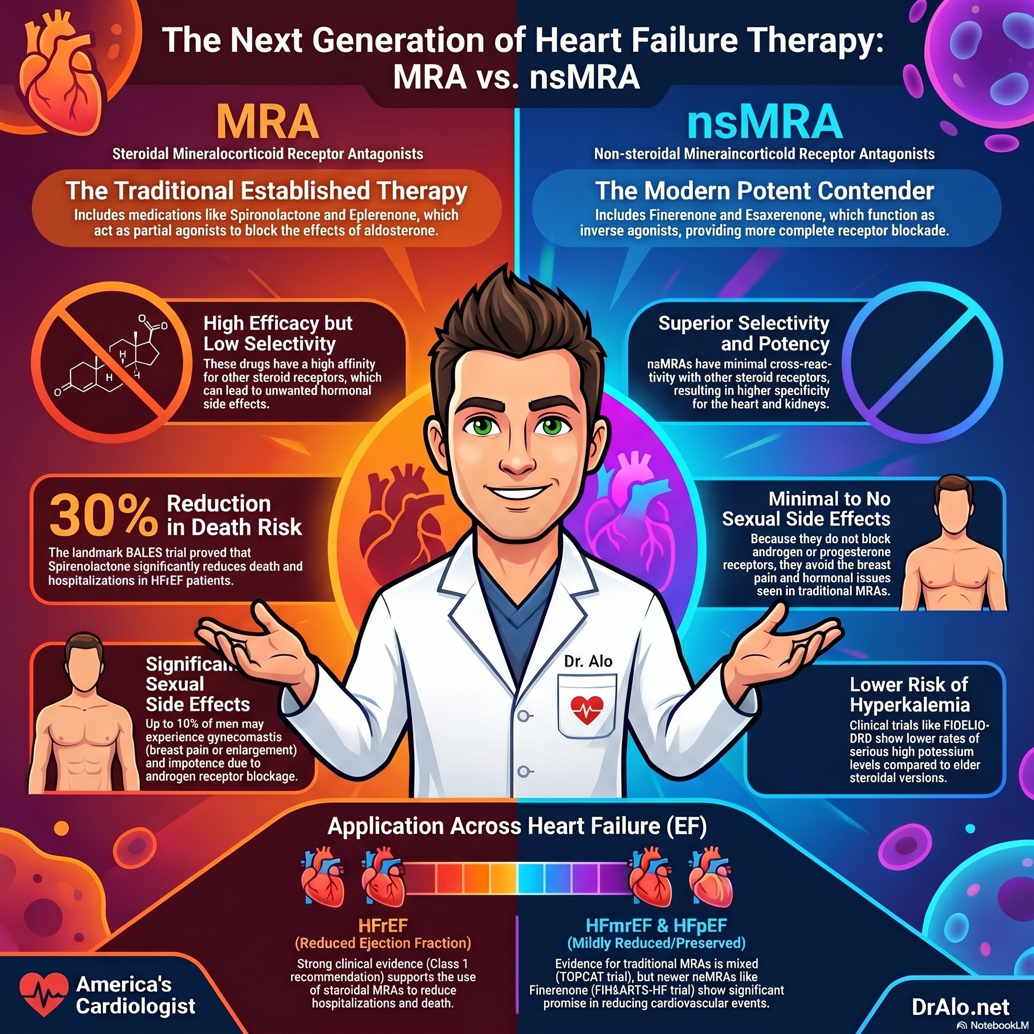 If you are a patient with heart failure and you are not on an MRA, it is worth asking your cardiologist why. The answer may be reasonable: your kidney function or potassium levels may make it unsafe at this time. But if the answer is simply that nobody got around to it, that is a gap worth closing. The mortality data in HFrEF are too good to ignore. And in HFpEF, finerenone is now an FDA-approved option with a positive trial result behind it.