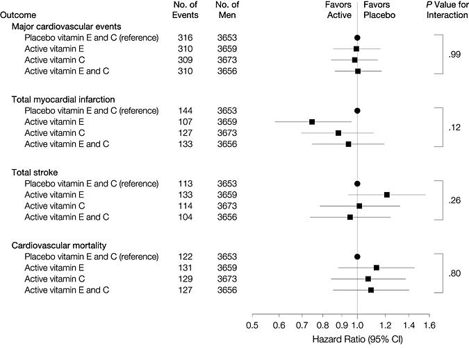 In another study, the Physicians' Health Study II, which randomized 14,641 male physicians to vitamin E, vitamin C, both, or placebo, found no benefit for major cardiovascular events, myocardial infarction, stroke, or cardiovascular mortality with either antioxidant alone or in combination.
