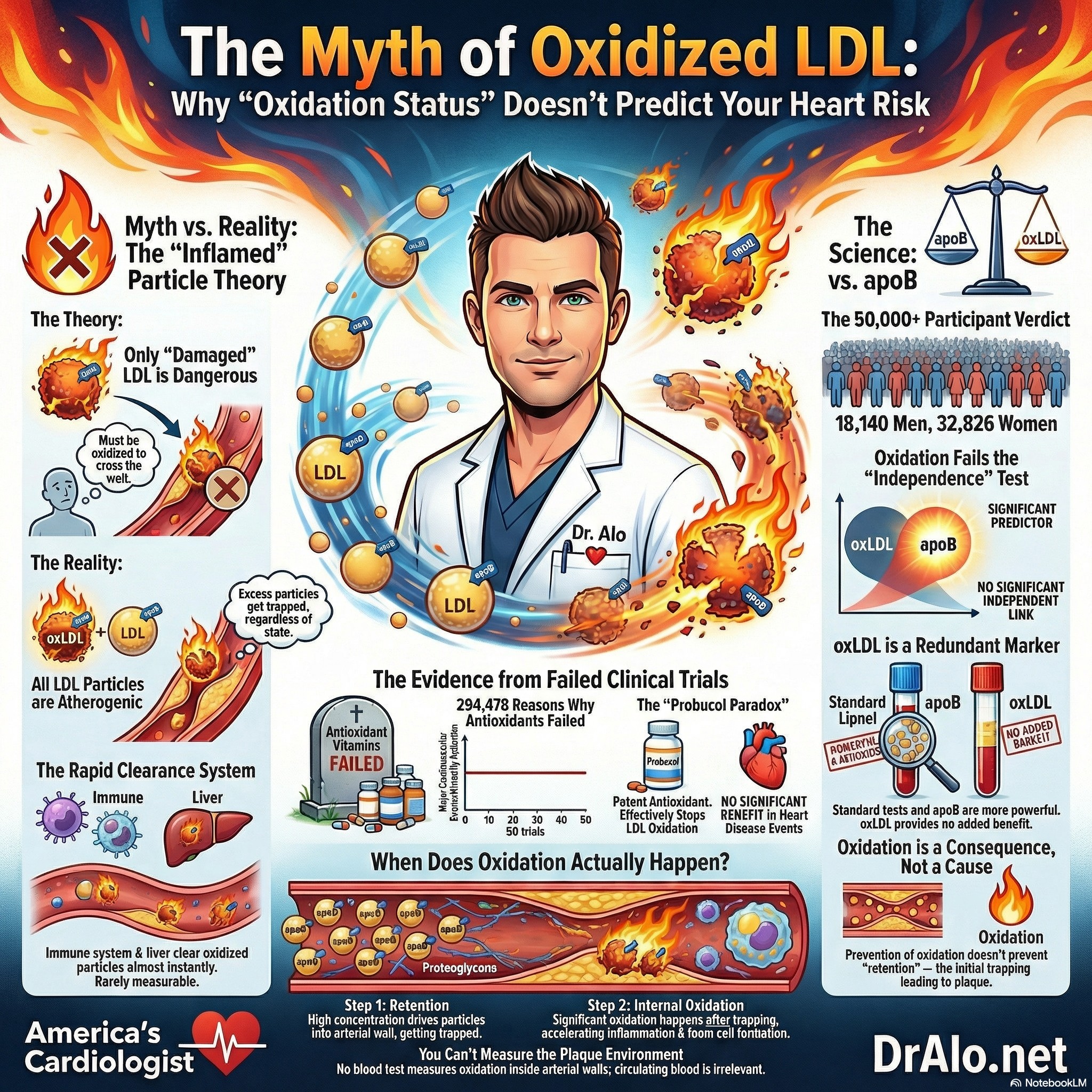 Multiple lines of evidence demonstrate that LDL oxidation status does not independently affect cardiovascular outcomes when adjusted for apoB particle number. The most direct evidence comes from antioxidant trials and circulating oxLDL measurement studies.