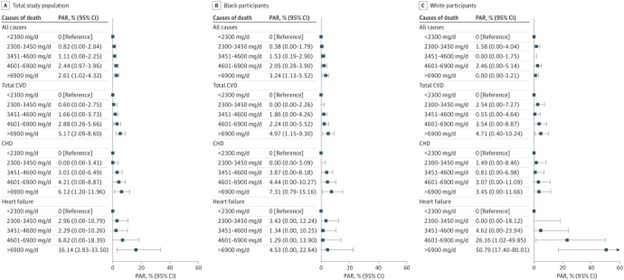 A 2024 JAMA Network Open study of predominantly low-income Black and White Americans found that excessive sodium intake was responsible for approximately 10% of total CVD deaths and about 30% of heart failure deaths in this population. The average daily intake was 4,512 mg in Black Americans and 4,041 mg in White Americans—substantially higher than the recommended 2,300 mg/day.