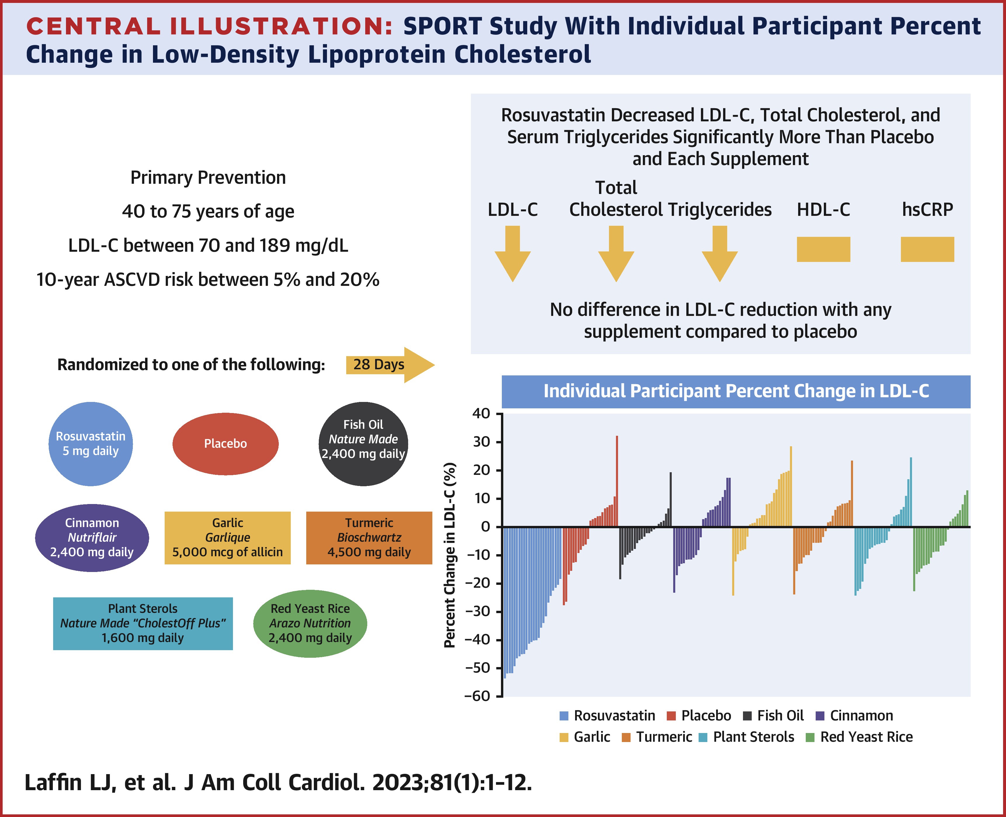 Laffin LJ, Bruemmer D, Garcia M, et al. Comparative Effects of Low-Dose Rosuvastatin, Placebo, and Dietary Supplements on Lipids and Inflammatory Biomarkers. J Am Coll Cardiol. 2023;81(1):1-12. doi:10.1016/j.jacc.2022.10.013 https://www.jacc.org/doi/10.1016/j.jacc.2022.10.013