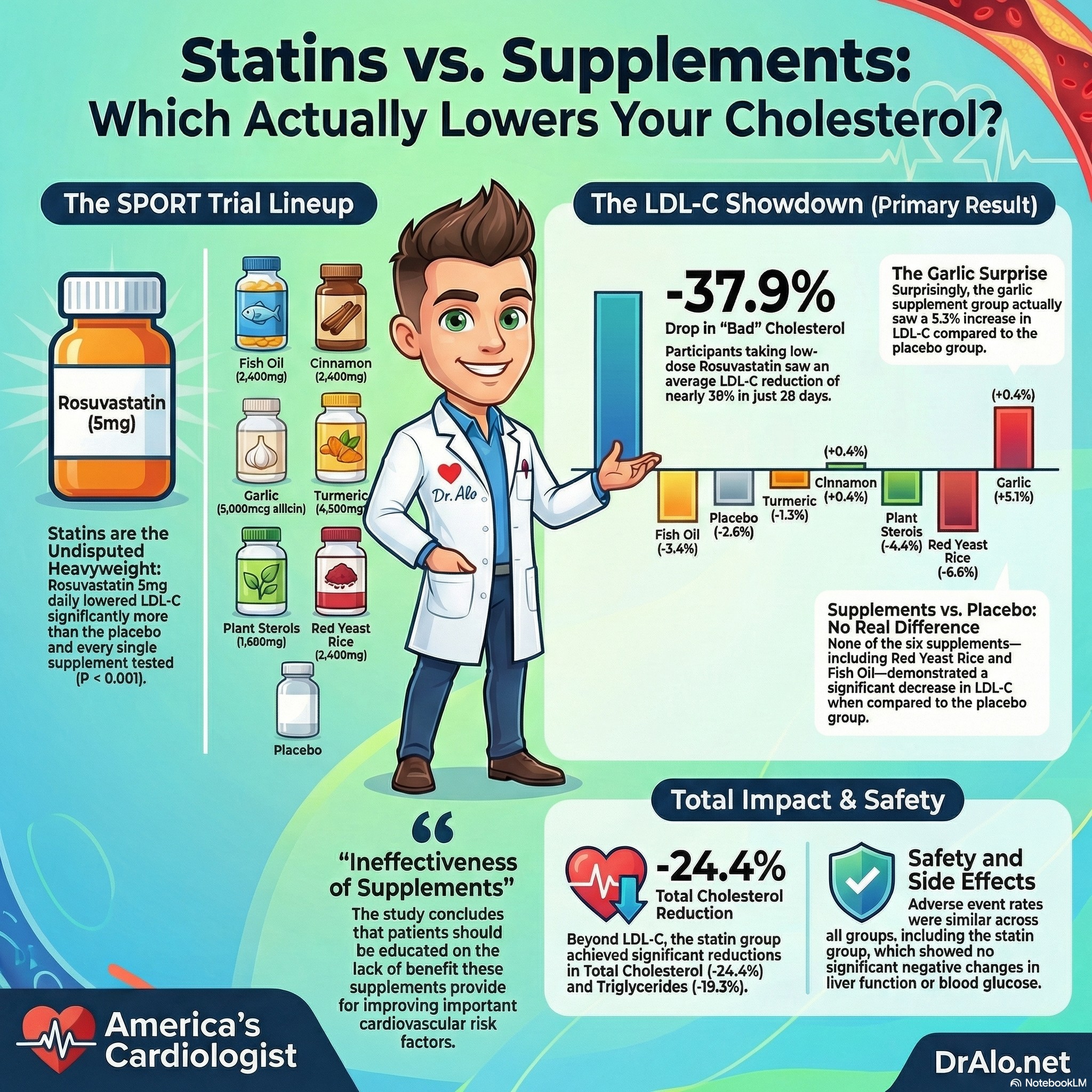 The SPORT trial is the most important supplement study published in cardiovascular medicine in years. In a well-designed, randomized, placebo-controlled trial of the six most popular cholesterol supplements at full commercial doses, over 28 days, in a real-world primary prevention population: