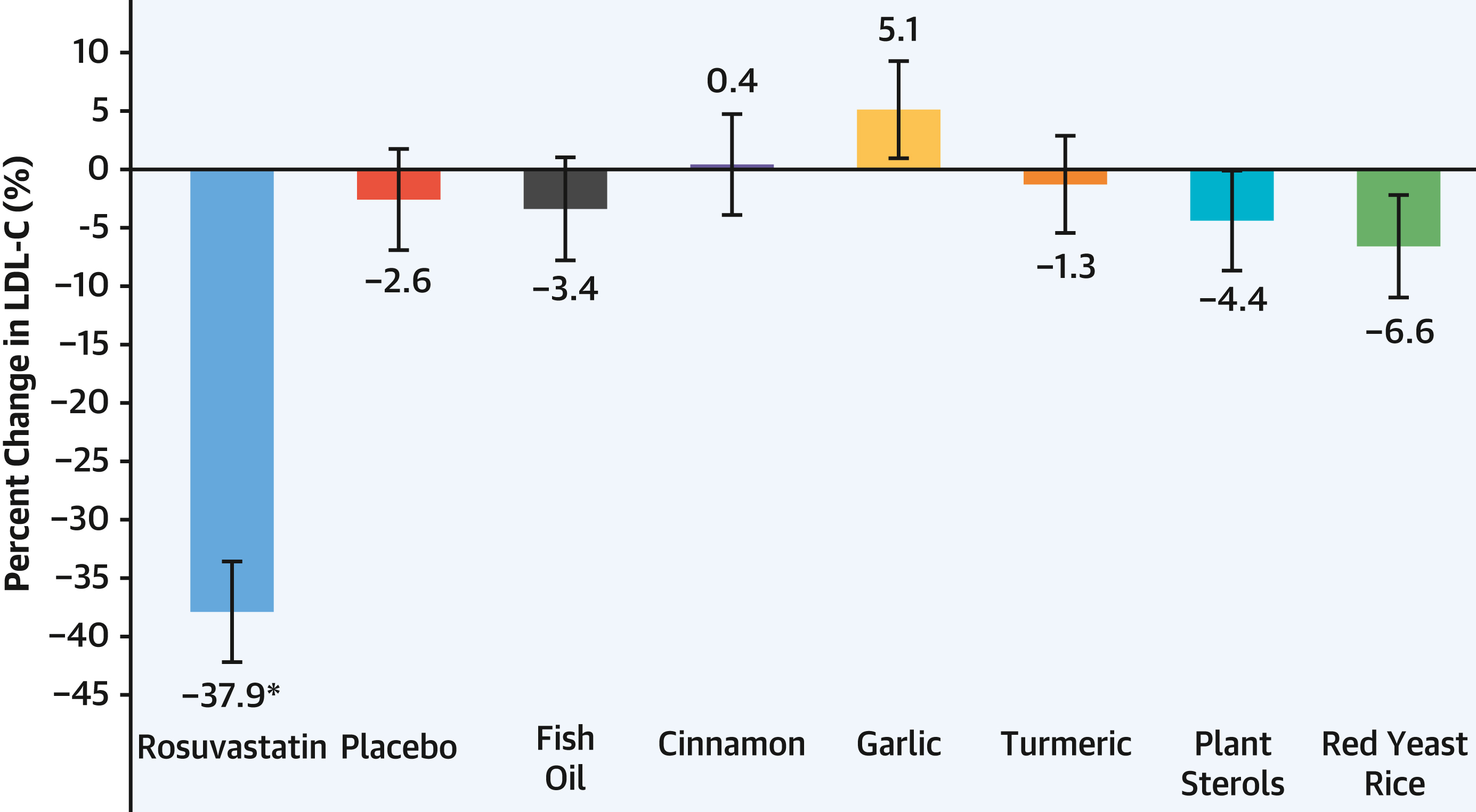 The numbers for the supplement arms were telling. Fish oil produced a 3.4% LDL reduction, not meaningfully different from the 2.6% placebo effect. Cinnamon produced a 0.4% increase. Turmeric produced a 1.3% decrease. Plant sterols produced a 4.4% decrease. Red yeast rice produced a 6.6% decrease. None of these reached statistical significance versus placebo.