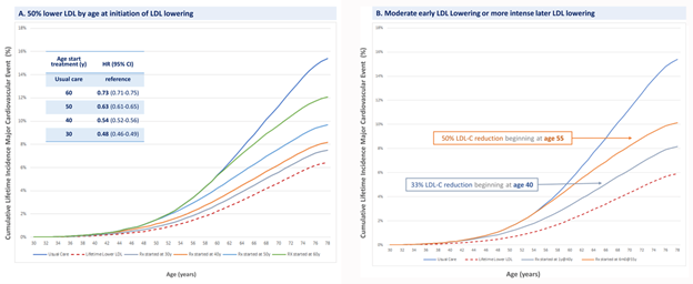 If your LDL-C was 135 mg/dL and you were to start on lipid lowering therapy at age 60, you would have a 27% reduction in MACE. If you were to start at age 50, you would have a 35% reduction in MACE. If you were to start at age 30, you would have a 52% reduction in cardiovascular event rates (MACE).