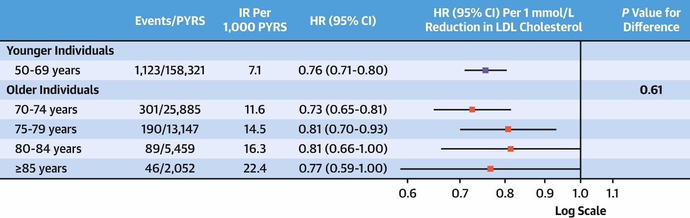 For each 1 mmol/L (38.6 mg/dL) reduction in LDL-C you had a 23% reduction in MACE in the elderly and for those who were younger.