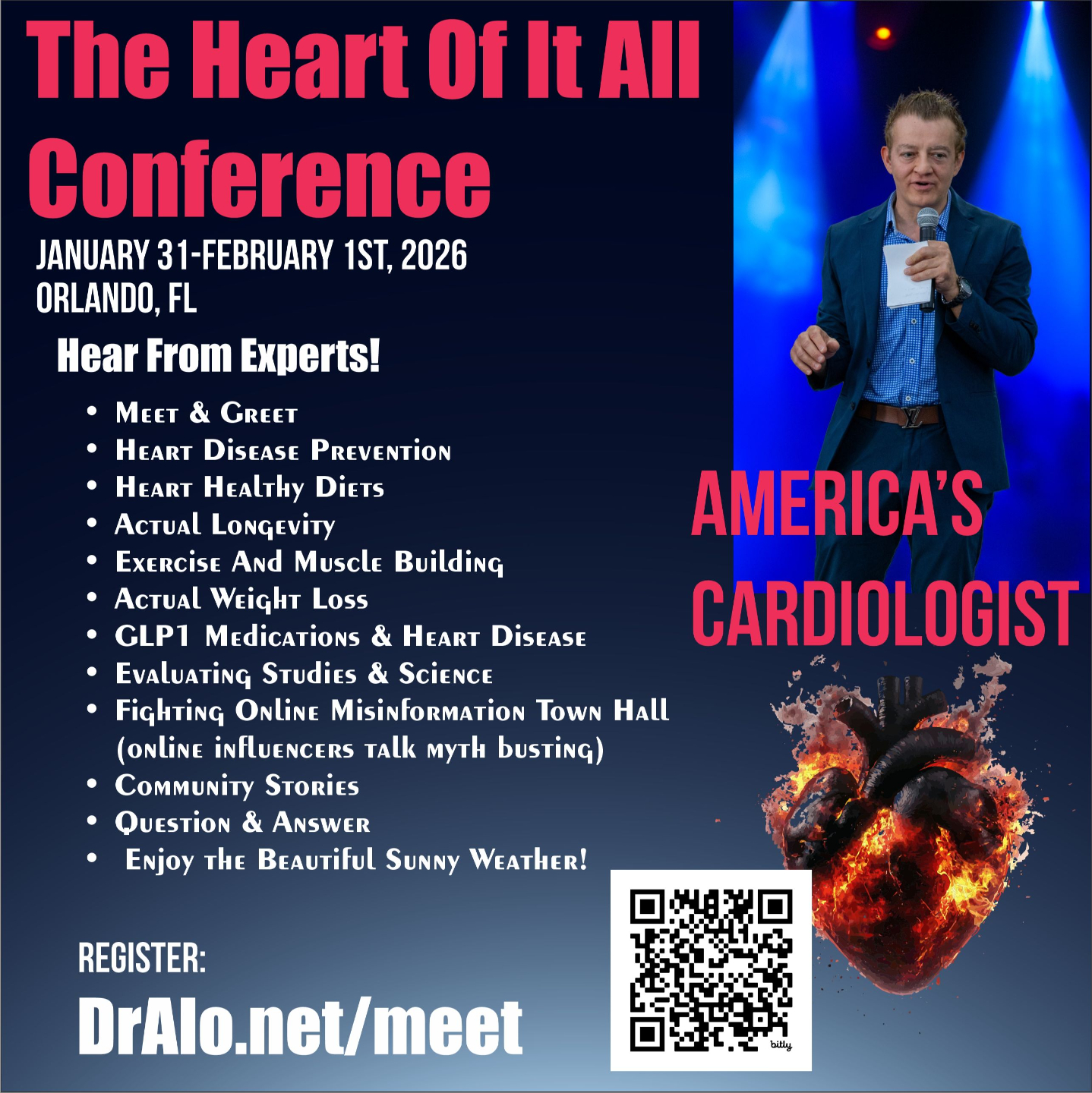 Special guests, speakers, physicians, and demonstrations. Evidence based heart disease, prevention, nutrition, exercise, fitness, and longevity.